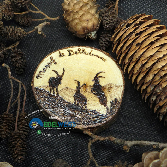 Belledonne - bouquetins. Le bouquetin, symbole des magnifiques montagnes autour de Grenoble. Aimant fait main, avec la technique de pyrogravure sur rondelle de bouleau. Diamètre 6 cm, avec un puissant aimant en néodyme appliqué au dos.