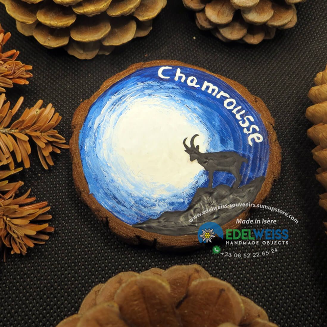 Chamrousse – bouquetin avec la lune. Un bouquetin au clair de lune sur cet aimant réalisé entièrement à la main avec des couleurs acryliques sur une rondelle de pin. Scellé avec un vernis transparent non toxique pour protéger la peinture dans le temps. Pièce unique. Diamètre de l'aimant environ 6,5 cm, avec un puissant aimant néodyme appliqué au dos.