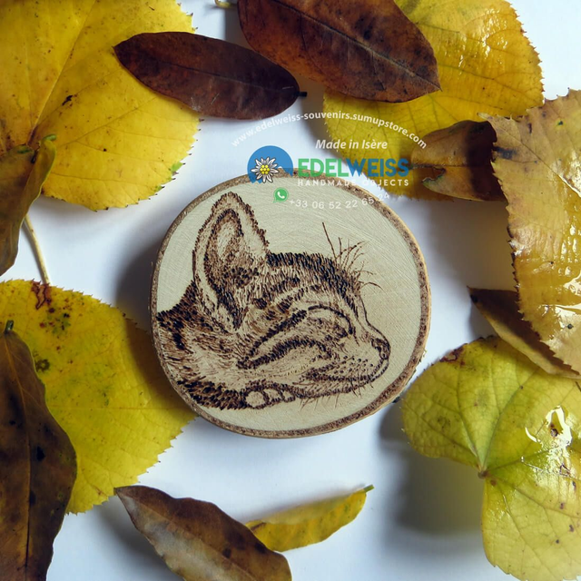 Chat dort. Le doux profil de ce chaton endormi est un aimant personnalisable, fabriqué à la main avec la technique de pyrogravure, sur une rondelle de bouleau. Diamètre environ 7 cm, avec un puissant aimant au néodyme appliqué derrière.
