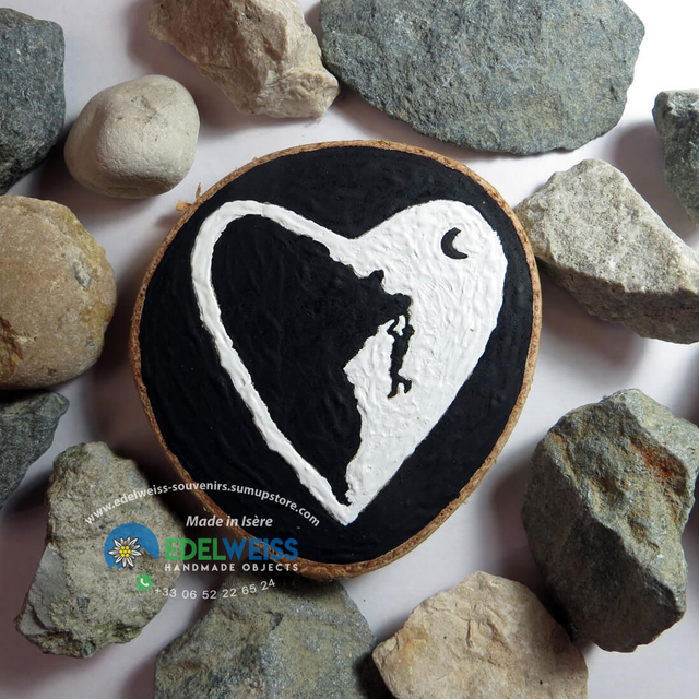 Escalade cœur blanc. Aimant personnalisable, fait à la main, peint aux couleurs acryliques, sur rondelle de bouleau. Diamètre environ 7,5 cm, avec un puissant aimant en néodyme appliqué derrière.