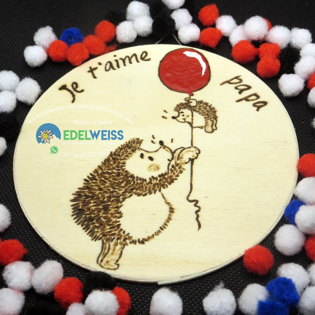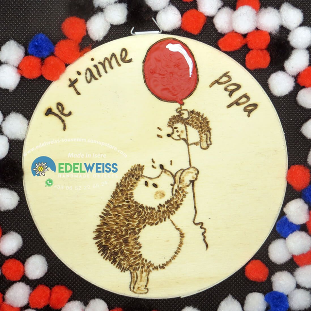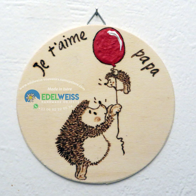 Grand et petit hérisson - je t’aime papa. Joli tableau, pour tous les papas, réalisé entièrement à la main, avec la technique de pyrogravure et l’ajout de couleur acrylique, sur une planche de peuplier d’un diamètre de 12 cm et 3 mm d’épaisseur, finition avec un fixateur opaque transparent non toxique pour assurer sa tenue dans le temps. Pièce unique entièrement réalisée à la main, prête à accrocher. Des personnalisations sont possibles sur demande.