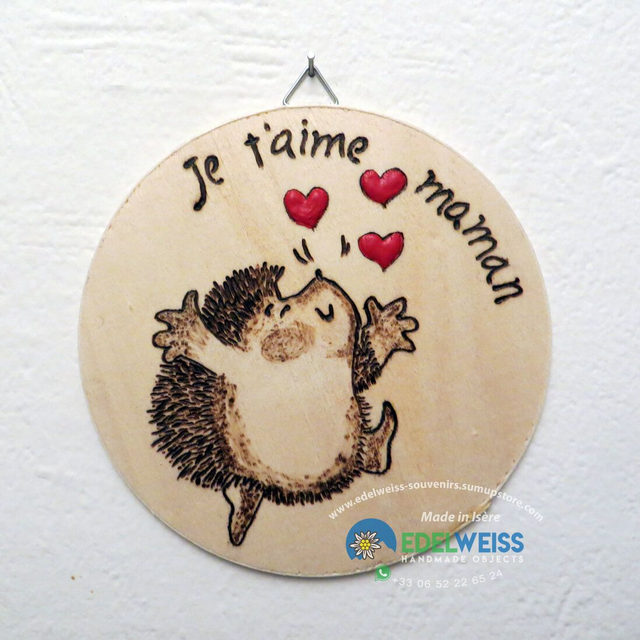 Hérisson petits coeurs - je t'aime maman. Joli tableau, pour toutes les mamans, réalisé entièrement à la main, avec la technique de pyrogravure et l’ajout de couleur acrylique, sur une planche de peuplier d’un diamètre de 12 cm et 3 mm d’épaisseur, finition avec un fixateur opaque transparent non toxique pour assurer sa tenue dans le temps. Pièce unique entièrement réalisée à la main, prête à accrocher. Des personnalisations sont possibles sur demande.