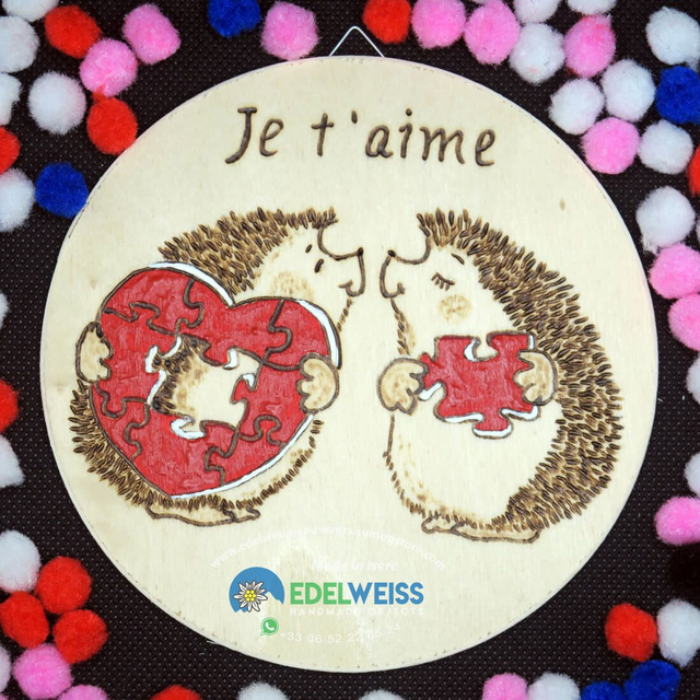 Hérissons avec cœur de puzzle - je t'aime. Joli tableau, pour tous les amoureux, réalisé entièrement à la main, avec la technique de pyrogravure et l’ajout de couleur acrylique, sur une planche de peuplier d’un diamètre de 12 cm et 3 mm d’épaisseur, finition avec un fixateur opaque transparent non toxique pour assurer sa tenue dans le temps. Pièce unique entièrement réalisée à la main, prête à accrocher. Des personnalisations sont possibles sur demande.
