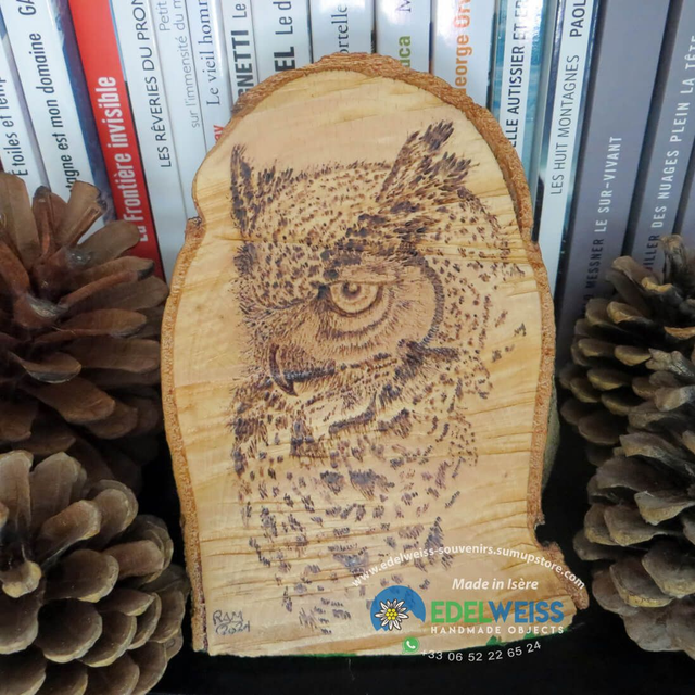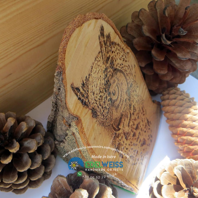 Objet de décoration pyrogravé sur tronc de hêtre représentant le hibou grand-duc, le plus grand rapace nocturne du monde.