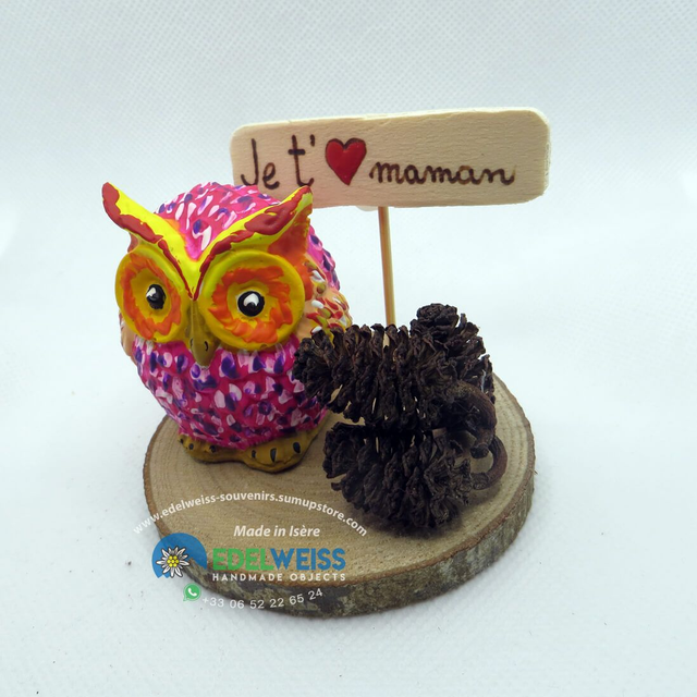Fabriqué entièrement à la main. La base est une rondelle de châtaigne d'un diamètre compris entre 7 et 8 cm. Le hibou, haut de 5 cm, est fabriqué avec de la poudre de céramique et peint à la main avec des couleurs acryliques. La création est complétée par de petites pommes de pin en aulne noir (alnus glutinosa) et une petite enseigne personnalisable en bois de peuplier recyclé.