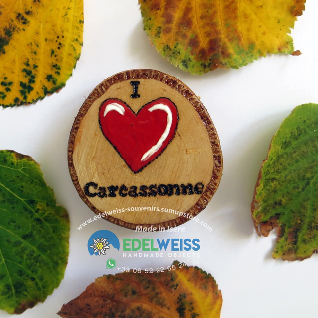 I love Carcassonne. Aimant fait main, peint aux couleurs acryliques et pyrogravé, sur rondelle de bouleau. Diamètre 5 cm, avec un puissant aimant au néodyme appliqué derrière.