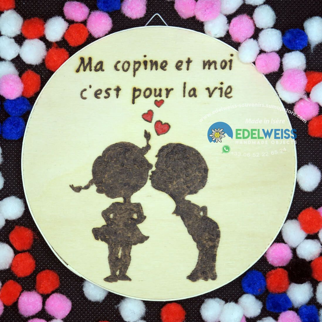 Ma copine et moi… .Joli tableau, pour tous les amoureux, réalisé entièrement à la main, avec la technique de pyrogravure et l’ajout de couleur acrylique, sur une planche de peuplier d’un diamètre de 12 cm et 3 mm d’épaisseur, finition avec un fixateur opaque transparent non toxique pour assurer sa tenue dans le temps. Pièce unique entièrement réalisée à la main, prête à accrocher. Des personnalisations sont possibles sur demande.