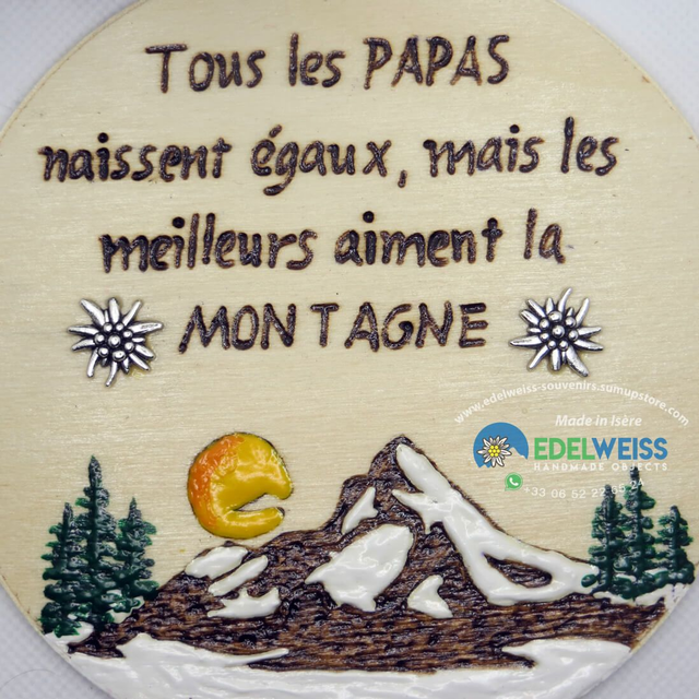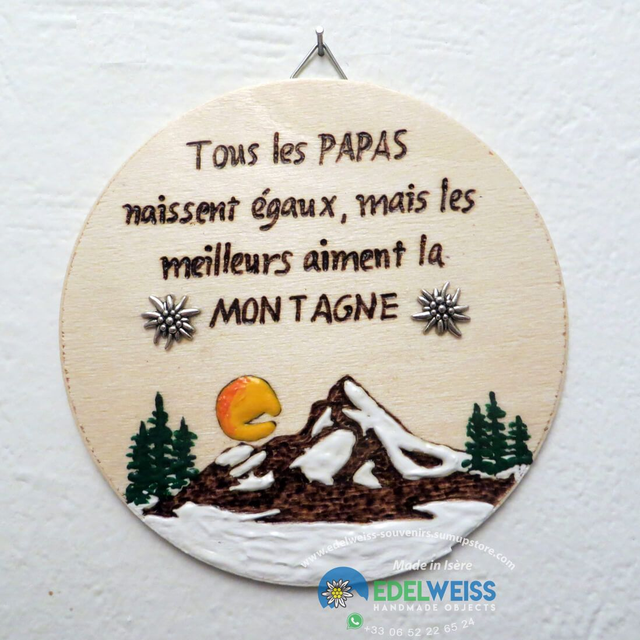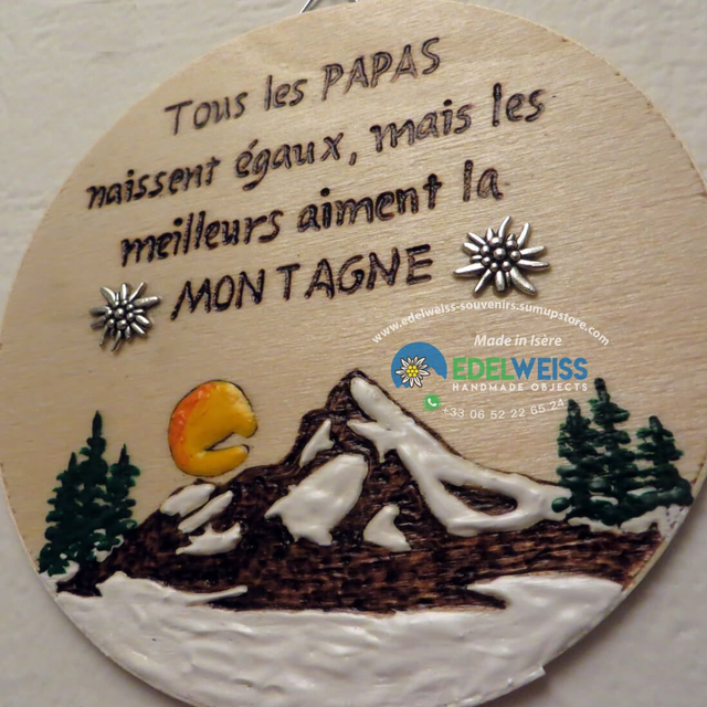 Joli tableau, pour tous les papas, fait main aux couleurs acryliques en relief, sur rondelle de peuplier d’un diamètre de 12 cm et d’une épaisseur de 3 mm, avec l’ajout de deux edelweiss argenté. Prêt à accrocher.