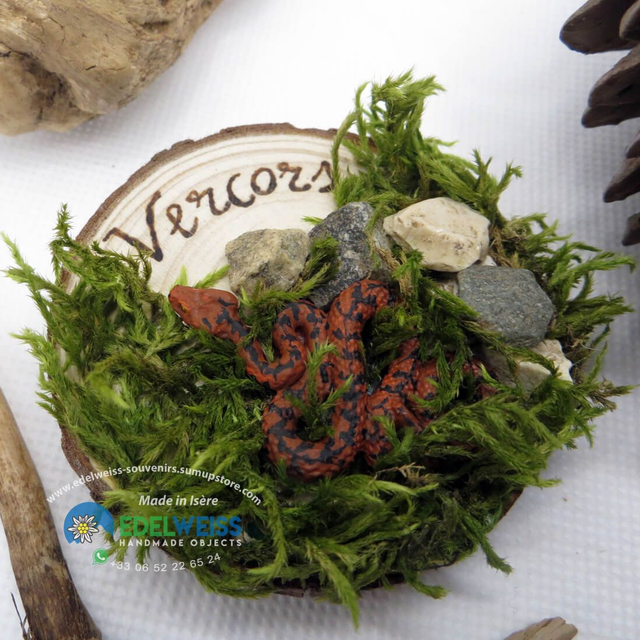 On le retrouve sur cet aimant 3D fait à la main sur une rondelle de pin d'un diamètre de 6 cm. Vipère en poudre de céramique et peinte à la main aux couleurs acryliques, avec l'ajout de mousse et de petites pierres. Complet avec un puissant aimant au néodyme appliqué au dos.