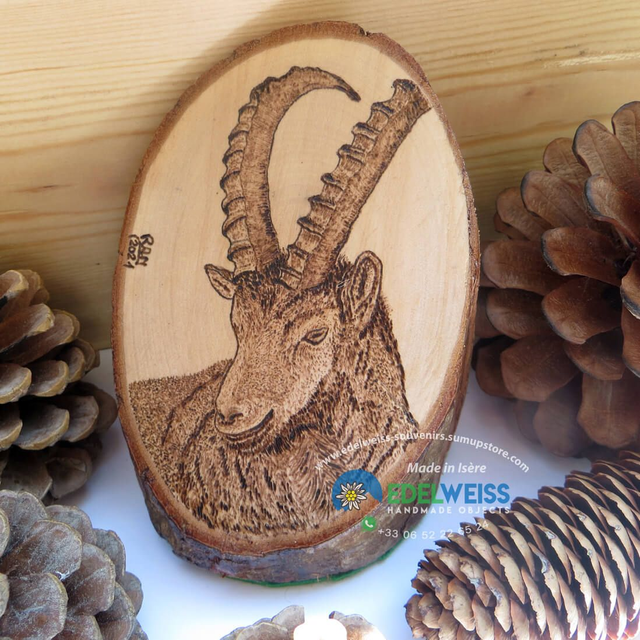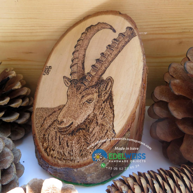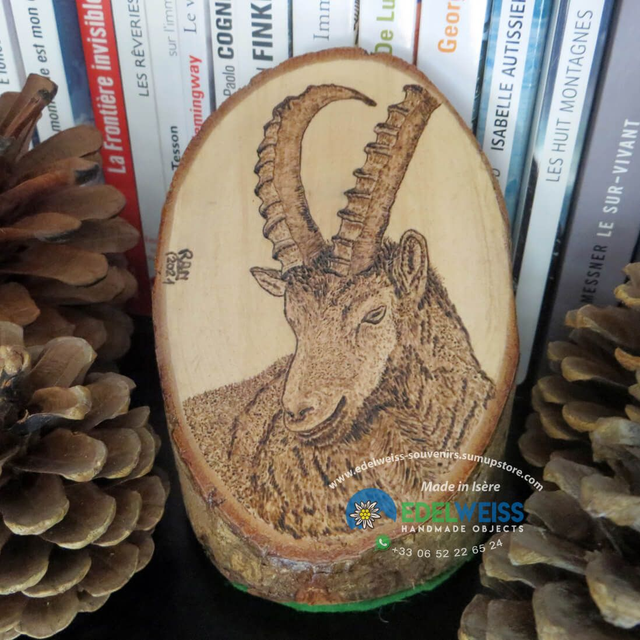Objet de décoration pyrogravé sur tronc de charme représentant le bouquetin, le roi des Alpes.